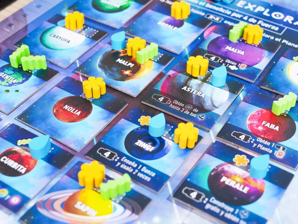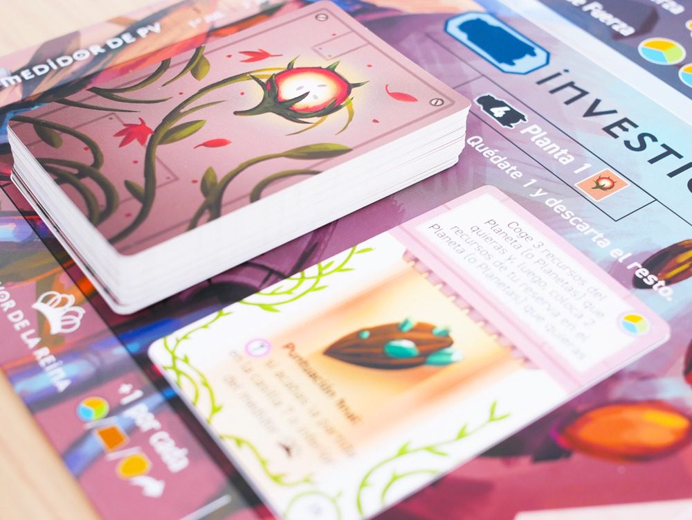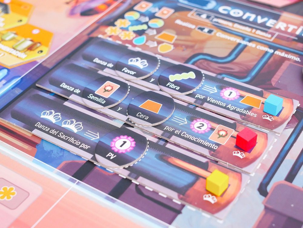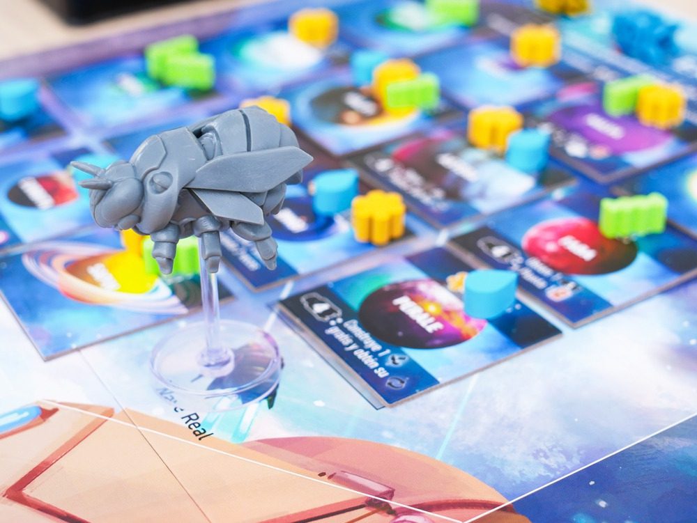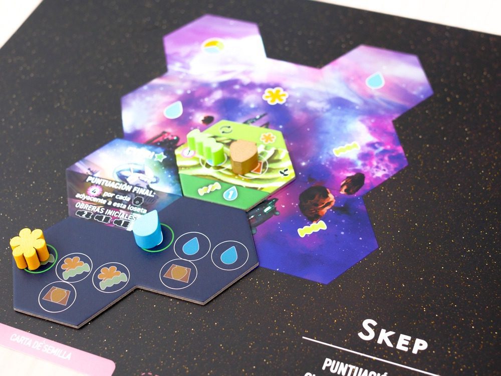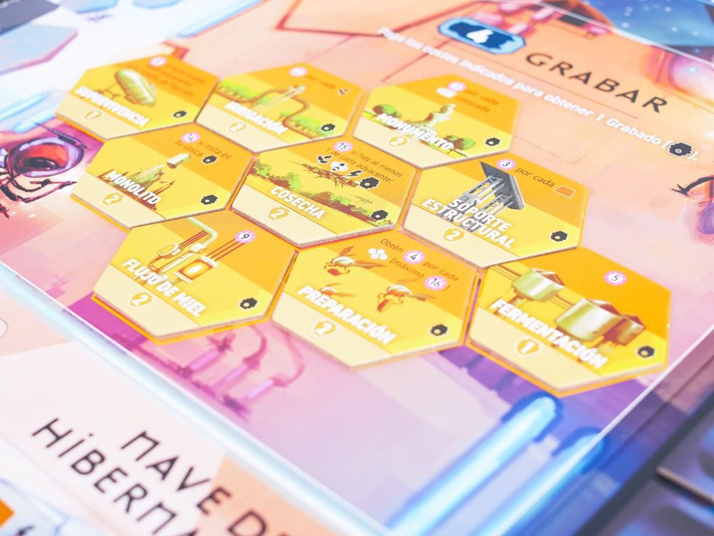 Componentes del juego | 1 figura de nave real, 1 guía de aprendizaje, 15 panales, 20 figuras de obrera, 29 losetas de desarrollo, 30 losetas de grabado, 30 losetas de recluta, 40 losetas de cultivo, 5 tableros de colmena, 1 apéndice, 1 tablero central, 5 ayudas de jugador |